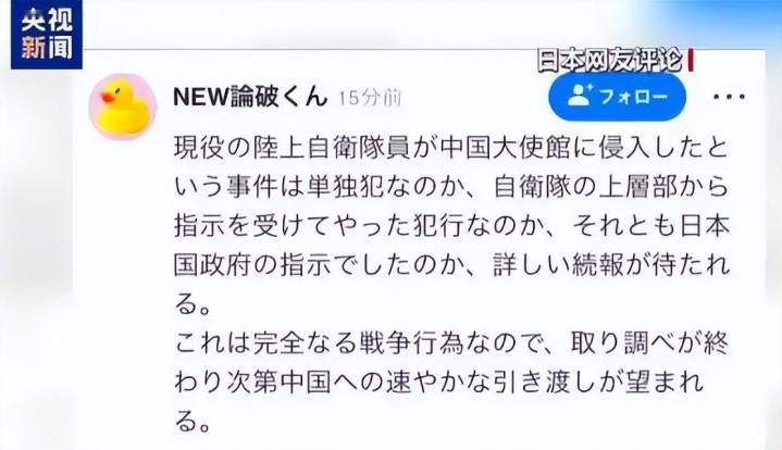 公共好我是老札,前几天又名拿着日本自保队证件的年青男人,硬生生翻墙闯进了中国驻日本大使馆,还公然叫嚣要以“神的风景”杀害中海酬酢东谈主员。