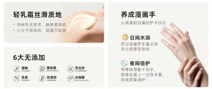 质量为细致乳霜状,推开后采纳速率适中,采纳后肌肤名义清楚无黏腻感,不会影响手机操作、衣物战争等平淡行为。洗手后薄涂可快速补充肌肤水分,睡前厚敷可当作肤浅手膜使用,家务劳顿、通勤出门、办公补涂等场景均适配,干皮、油皮、明锐肌等万般肤质均可使用,是兼顾好意思白、保湿、修护的平衡型产物。