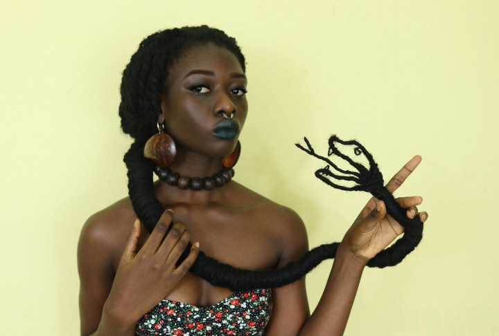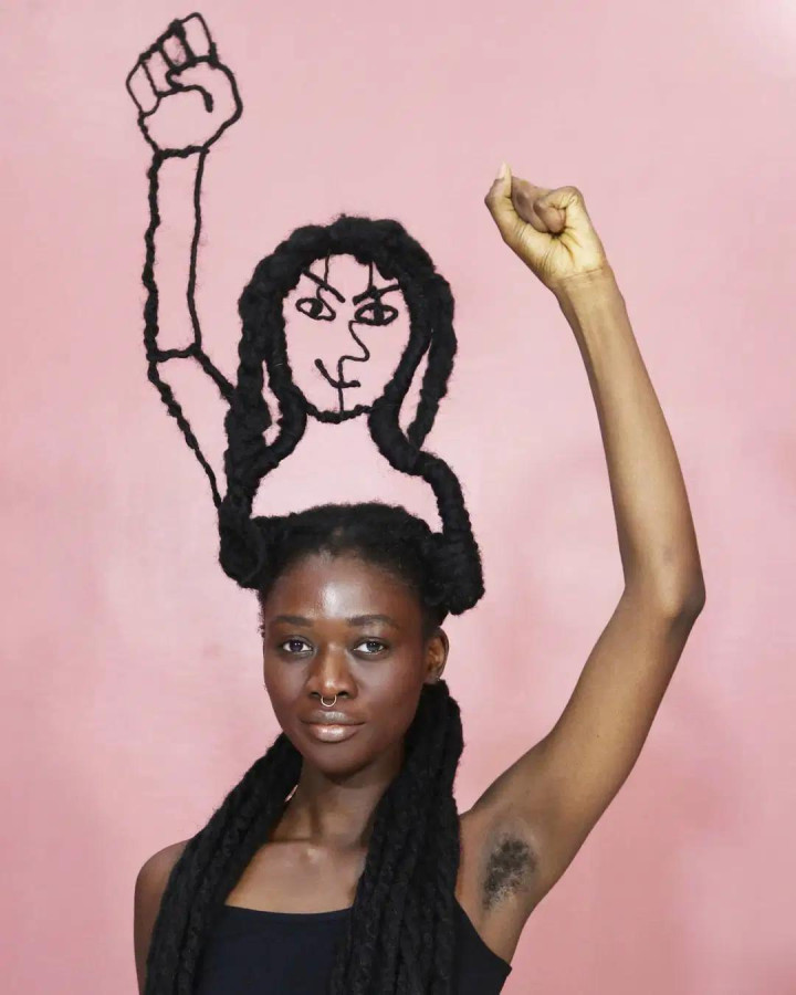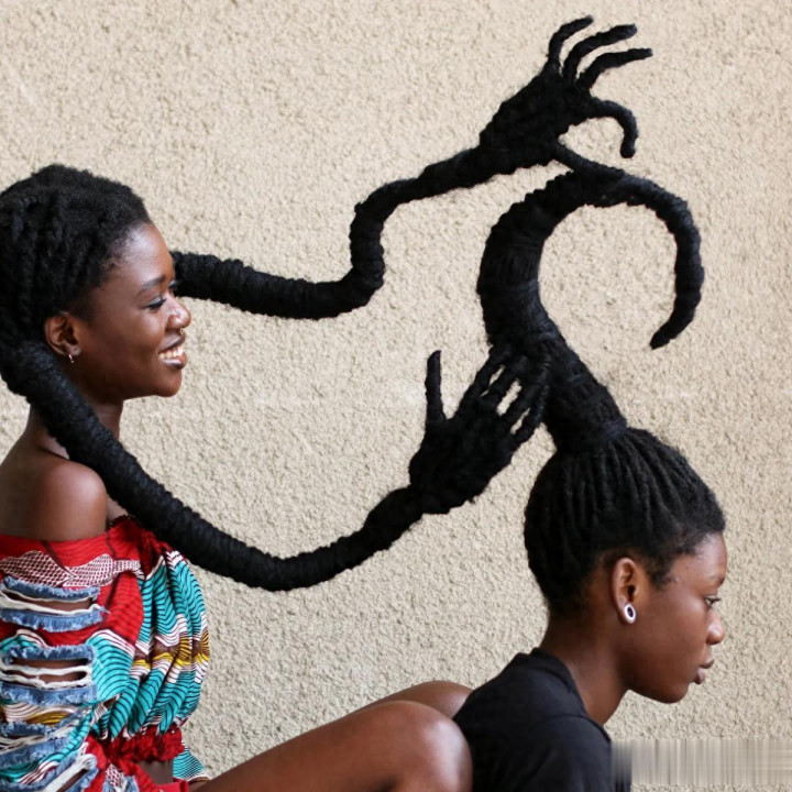 科特迪瓦艺术家莱蒂西娅·基经常以我方的头发为素材创作发型雕镂。但在一次荒僻的碎裂中,她让妹妹参与其中,以此展现两东说念主之间深厚的羁绊。
