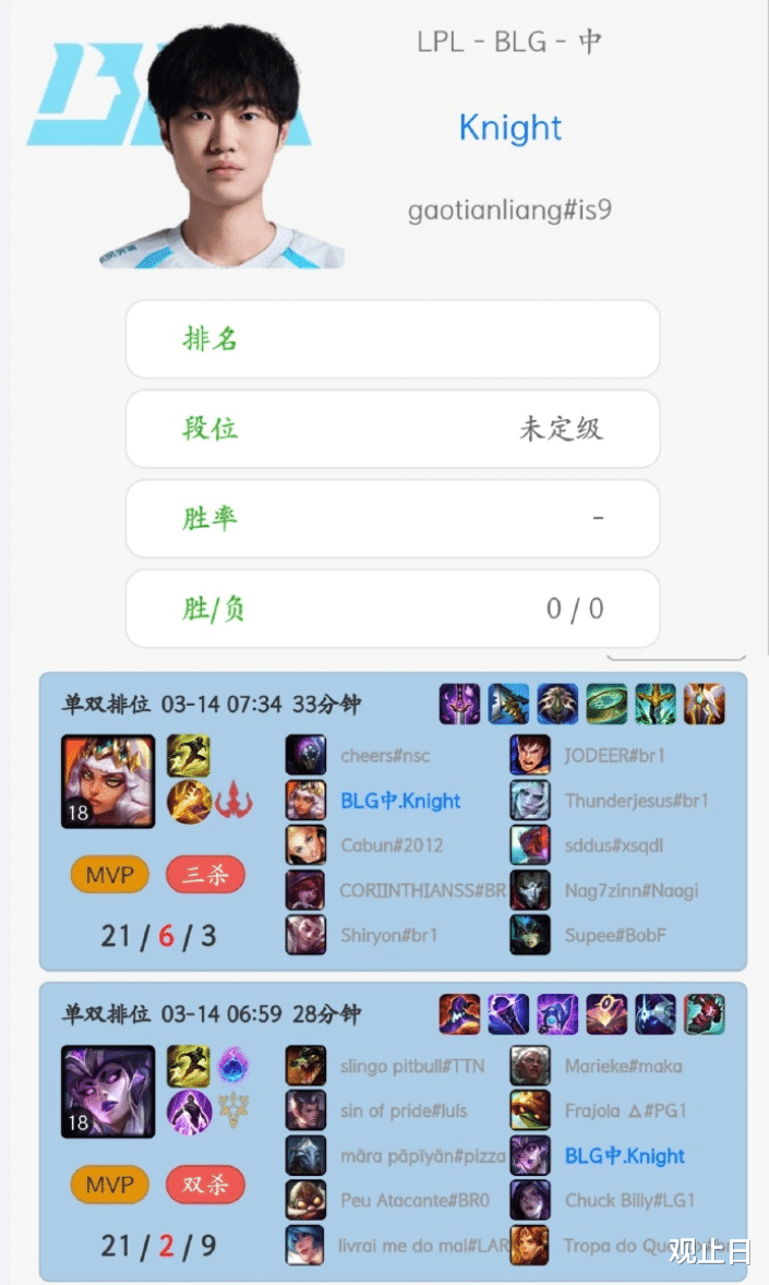 BLG全队抵达巴西备战大家前卫赛,中单Knight入乡顺俗注册了新账号。后果ID一亮,老粉丝平直破防: