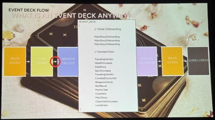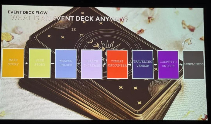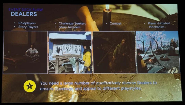 通过糊涂内容之间的鸿沟,事件牌组能给斗争、露营这类机制玩法,注入叙事内容,让可爱剧情的玩家也更满足体验;同期,它能让剧情内容,主动来到玩法型玩家面前,毋庸逼着他们走一条固定的线性道路,让玩法型玩家也能禁受并宠爱剧情内容。