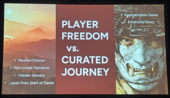 这等于咱们濒临的中枢难题。你们可能会想,这不是续作吗?《对马岛之魂》里咱们没遇到过这些问题吗?事实上,咱们遇到过。但在那款游戏里,咱们通过截止玩家的目田,拼集贬责了这个问题。