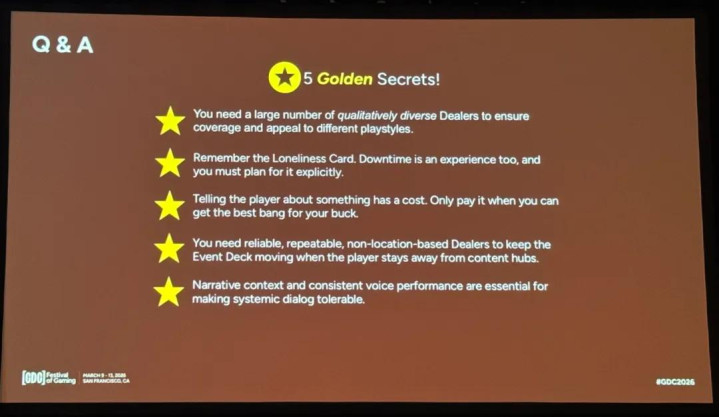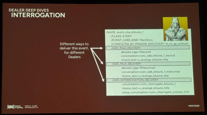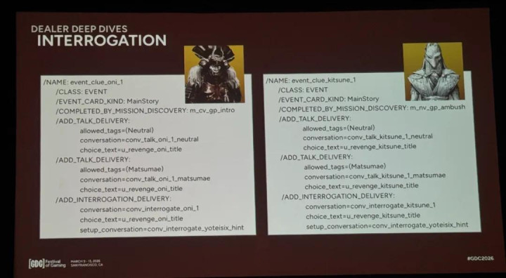 他们会说“我知谈一些对于羊蹄六东谈主帮的事”“你想知谈什么?”,这样联想的原因是,要是你玩过游戏就会知谈,在好多这类场景里,咱们其实会让玩家我方遴荐,要议论哪个头办法信息。刚才的共享里我没展示这一丝,因为会让系统变得更复杂,而且它不是事件牌组的必邀功能。
