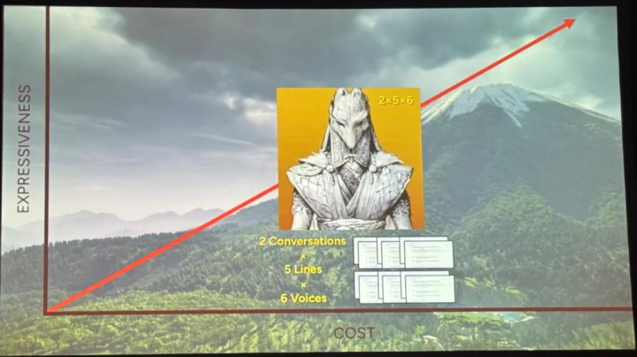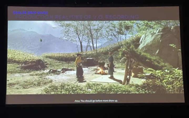 那《羊蹄山之魂》里,咱们用的是哪种决策?人人应该也猜到了,咱们不啻用了一种。对于最紧要的事件,比如刚才提到的狐的脚迹,咱们用了资本极端高的决策:每个事件写2段对话,每段5句台词,找6个配音演员录制。算下来,每个事件要录60句台词,资本一丝王人不低。