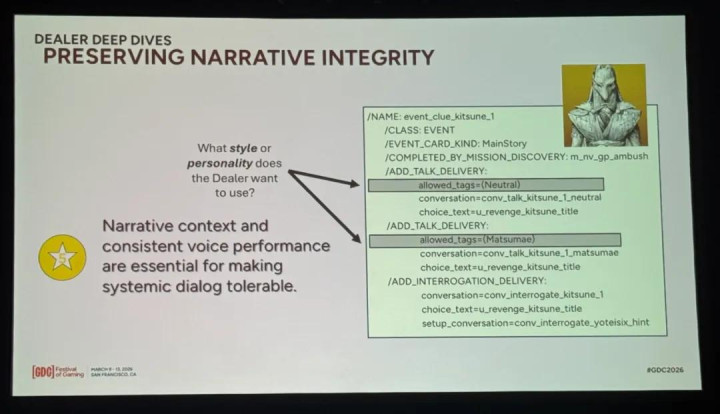但在这个例子里,系统顺利抽卡了,而且抽中了干线剧情卡。但一次审问,只靠一张卡牌是不够的,它需要对应的音频文献、字幕、面部动画数据。