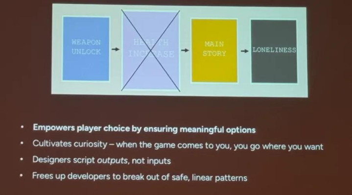 一方面,要是玩家信赖游戏会把内容带到我方面前,他就会更天然地随着我方的好奇心走,去我方想去的场合,不会总认为我方“玩错了游戏”。