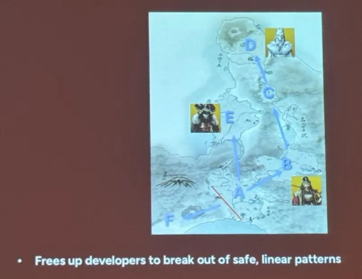 咱们作念了三幕式的结构,把岛屿分红了三个区域,用了最稳妥的联想:只好剧情股东到对应节点,玩家智商进入下一个区域。而《羊蹄山之魂》完全不同,咱们的区域数目是《对马岛之魂》的两倍,区域之间的结构瑕瑜线性的,叙事也瑕瑜线性的。