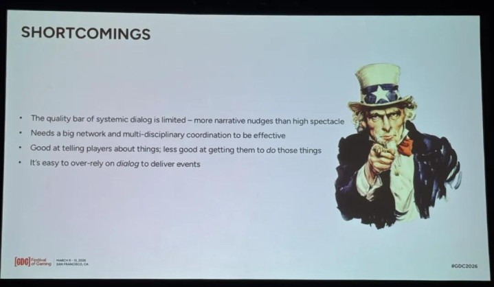 第一,系统型的发牌员,很恰当请托顺从固定例则的浅近交互,能给玩家正在作念的事,加入碎屑化的小故事,让游戏的体验更结伴。但它们没办法请托大型的、充满心理张力的、高献技成果的剧情名场所。至少咱们此次,没能作念到这一丝。