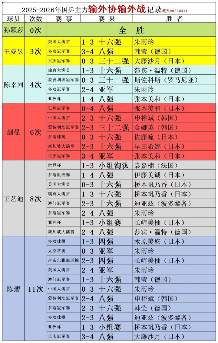 但正如数据所炫耀的那样,孙颖莎的宽敞之处并非在于从不输球,而在于她那近乎恐怖的对外作战结识性,回归2025-2026年,孙颖莎在单打外战中保持全胜,其中对日本选手更是屡次用“零封”的形势淘汰对方,这种“内战人人,外战更人人”的本性,在如今国乒女队时时被外协冲击的配景下,其含金量正在以肉眼可见的速率高潮。