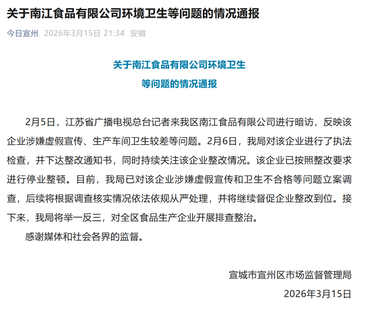大皖新闻讯3月15日晚,宣城市宣州区商场监督惩处局发布《对于南江食物有限公司环境卫生等问题的情况通报》。