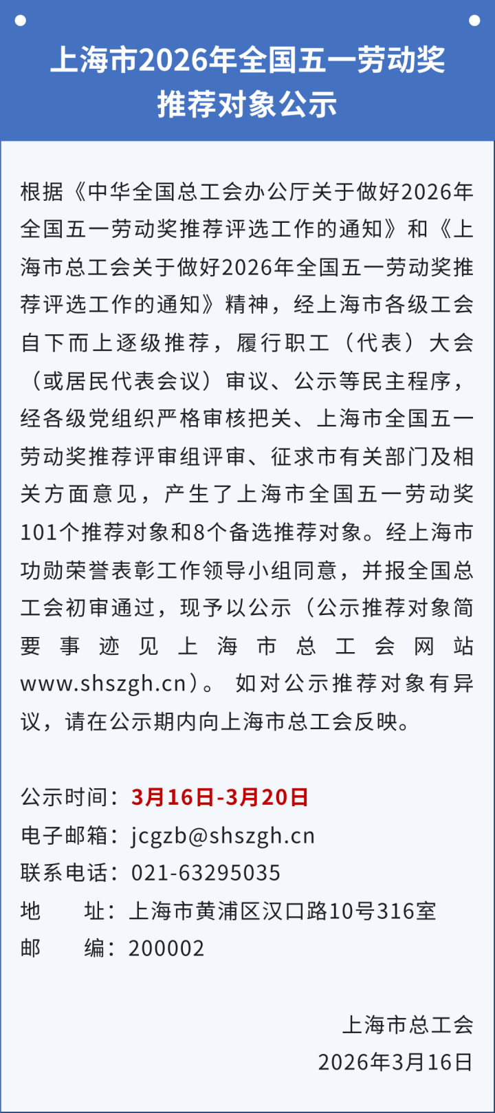 3月16日,上海市总工会微信公众号“申工社”发布上海市2026年寰宇五一劳动奖保举对象公示。上海共报101个保举对象和8个备选保举对象,其中: