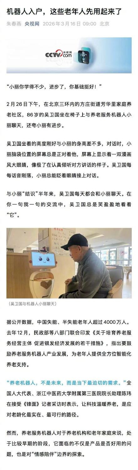 86岁的阿尔茨海默病老东说念主每天等机器东说念主小丽来聊天,他说“小丽不会走的”。当淡忘成为普通,一台机器反而成了恒常的伴随——这不是科幻,是北京养老社区正在发生的本质。面前,中国有4000万失能半失能老东说念主,hg真人照管员缺口高达1000万,机器东说念主养老已从“将来见地”酿成“当下刚需”。但科技养老的终极主张,不是让机器酿成东说念主,而是让老东说念主不再独处。