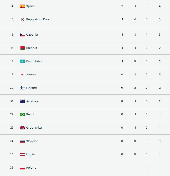 mei guo加多1金,以10金5银5铜继续排第二位。奥地利队加多1金1银,以7金2银4铜排第三位,飞腾了一位。人意大利队以6金7银1铜排第四位,下滑了一位。俄罗斯队加多1金,以5金1银3铜排第五位。法国队以4金4银3铜排第六位。