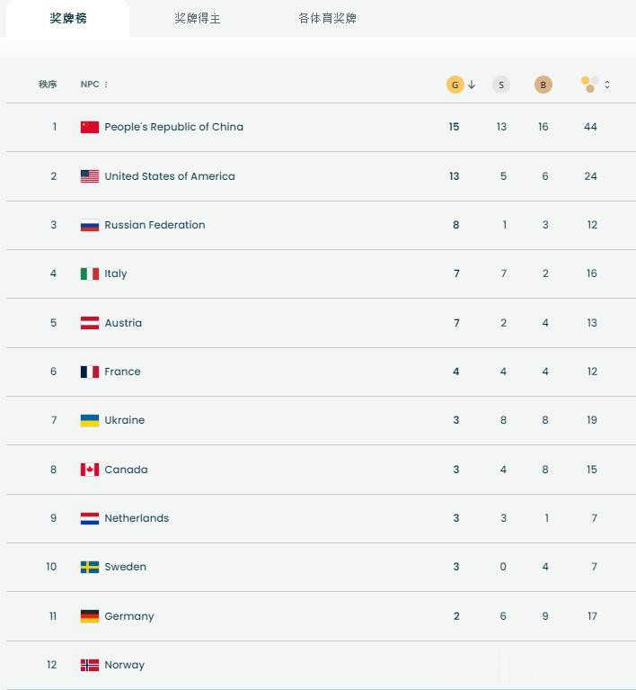 HoGaming 米兰冬残奥最终奖牌榜: 我国15金13银16铜居首, 比后两位之和还多