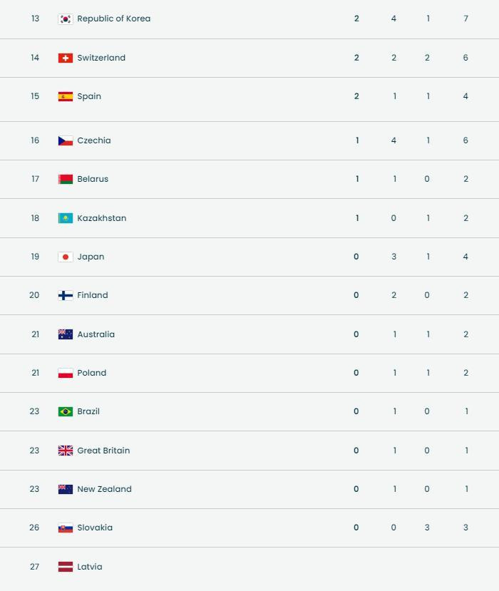 人意大利队以7金7银2铜(加多1金1铜)排第四。奥地利队以7金2银4铜排第五。法国队以4金4银4铜排第六。