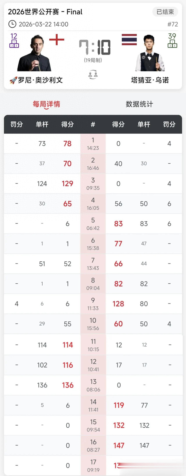 全场比赛,塔猜亚打出3杆过百6杆50+,奥沙利文打出4杆过百2杆50+,最终,塔猜亚登顶得胜。