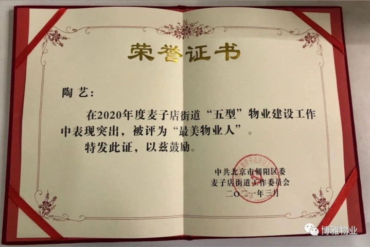 2021年3月31日下昼,春风和煦、暖阳怡东说念主,北京市向阳区麦子店街说念劳动委员会“物业不休劳动例会”在办事处多功能厅魁伟召开,这次会议中,北京市向阳区麦子店街说念工委会对在2020年度麦子店街说念“五型”物业建造劳动中作念出隆起孝顺的物业东说念主赐与犒赏,博雅物业博雅园服务中心形态司理陶艺喜获“最好意思物业东说念主”名称。