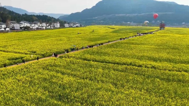 在平昌县白衣镇,金色油菜花海与古镇镇定情味横生,眩惑浩荡搭客前来踏青不雅光。