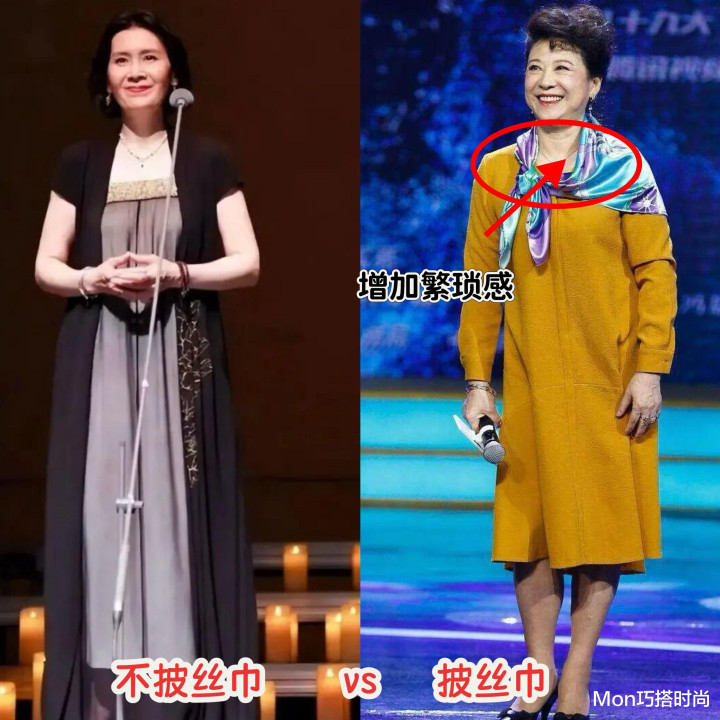 丝巾的加入还有一个问题,那即是会增多搭配的繁琐感,相称是把丝巾披在肩部,会袭击住我们的肩颈线条,显得上半身很痴肥,若是脖子短粗、脸大、上半身微胖,这样搭配确切hold不住,再看肖雄穿裙子,不披丝巾暴露了肩颈和锁骨,看着是不是清晰许多?全体搭配也更大气。