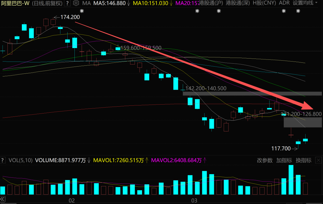 3月20日,港股的阿里巴巴紧接着大跌跳跃6%,3月23日又着落跳跃3%。