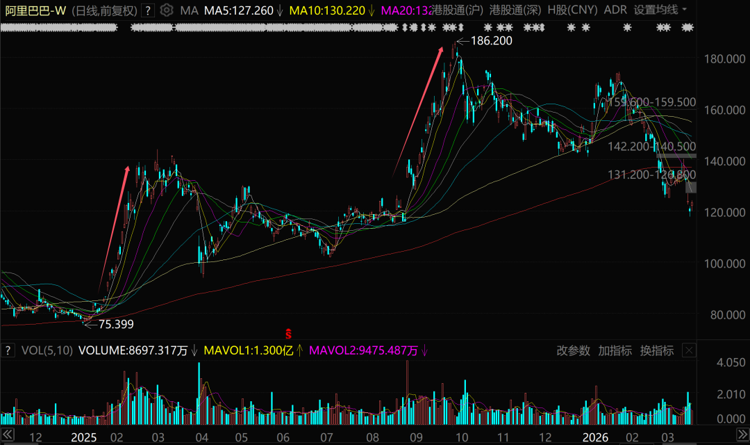 以上几个事件,又让阿里巴巴股价从8月底的115港元隔邻一说念单边暴涨到10月初的186港元。