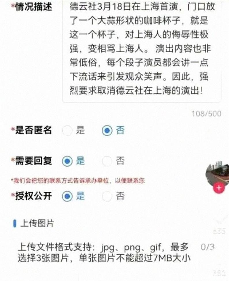 像片传得很快。 评述区运行出现不雷同的声息。 有上海腹地IP的网友径直发视频,说依然通过12345举报了。 举报意义很径直:这个大蒜造型的杯子,是对上海东说念主的侮辱。 视频里,举报者口吻很硬,说德云社的段子低俗,上海腹地有独脚戏、滑稽戏和沪剧,德云社不该来,敕令大师通盘投诉,把德云社“赶出上海”。