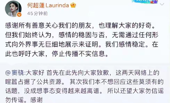 跟着,窦骁、何超莲同步发声明,愈演愈烈的传言才按下了暂停键。