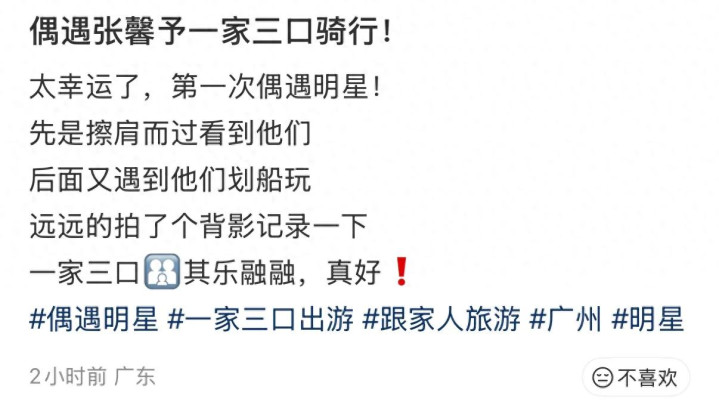 3月15日,有网友在粗放平台晒照默示在广州偶遇张馨予一家三口骑行,其后还遭受他们一皆荡舟,一家三口其乐融融,绝顶温馨有爱。